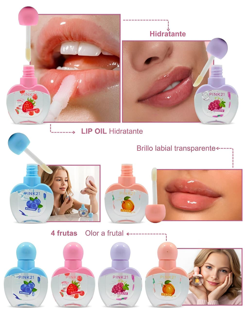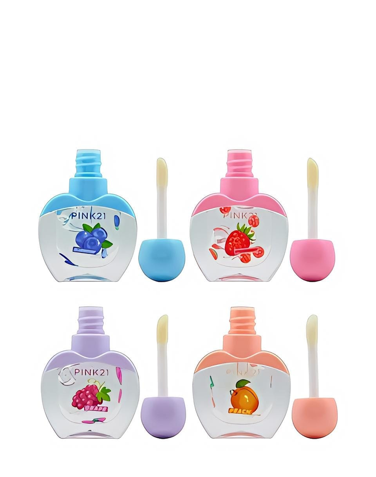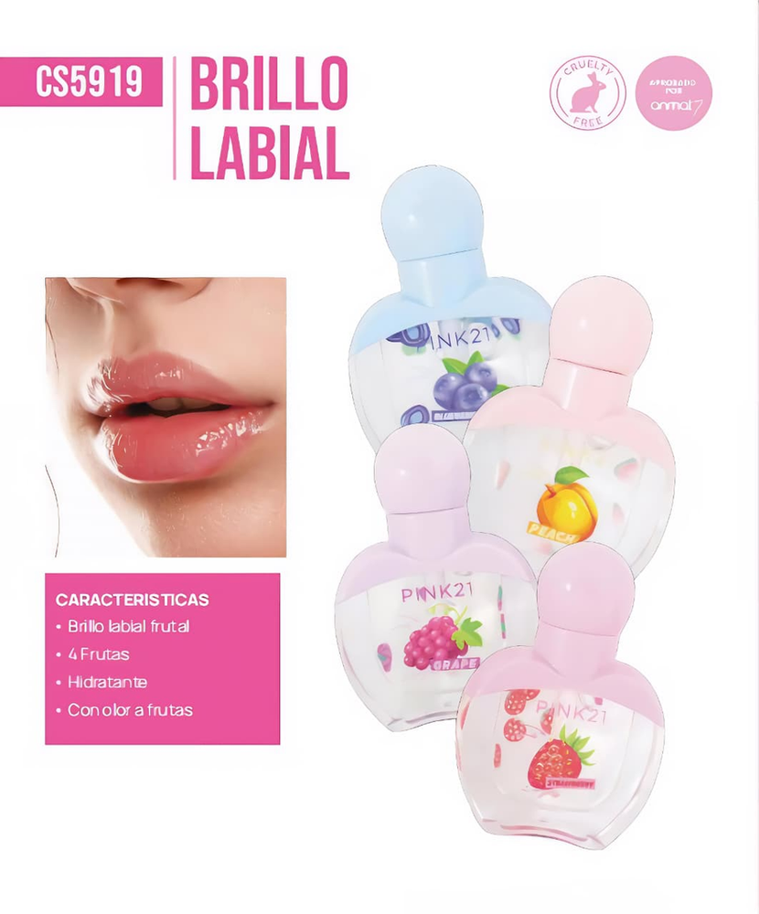 (Brillo labial con color transparente y frutitas decorativas. Está diseñado para ser ideal para usar durante todo el día).