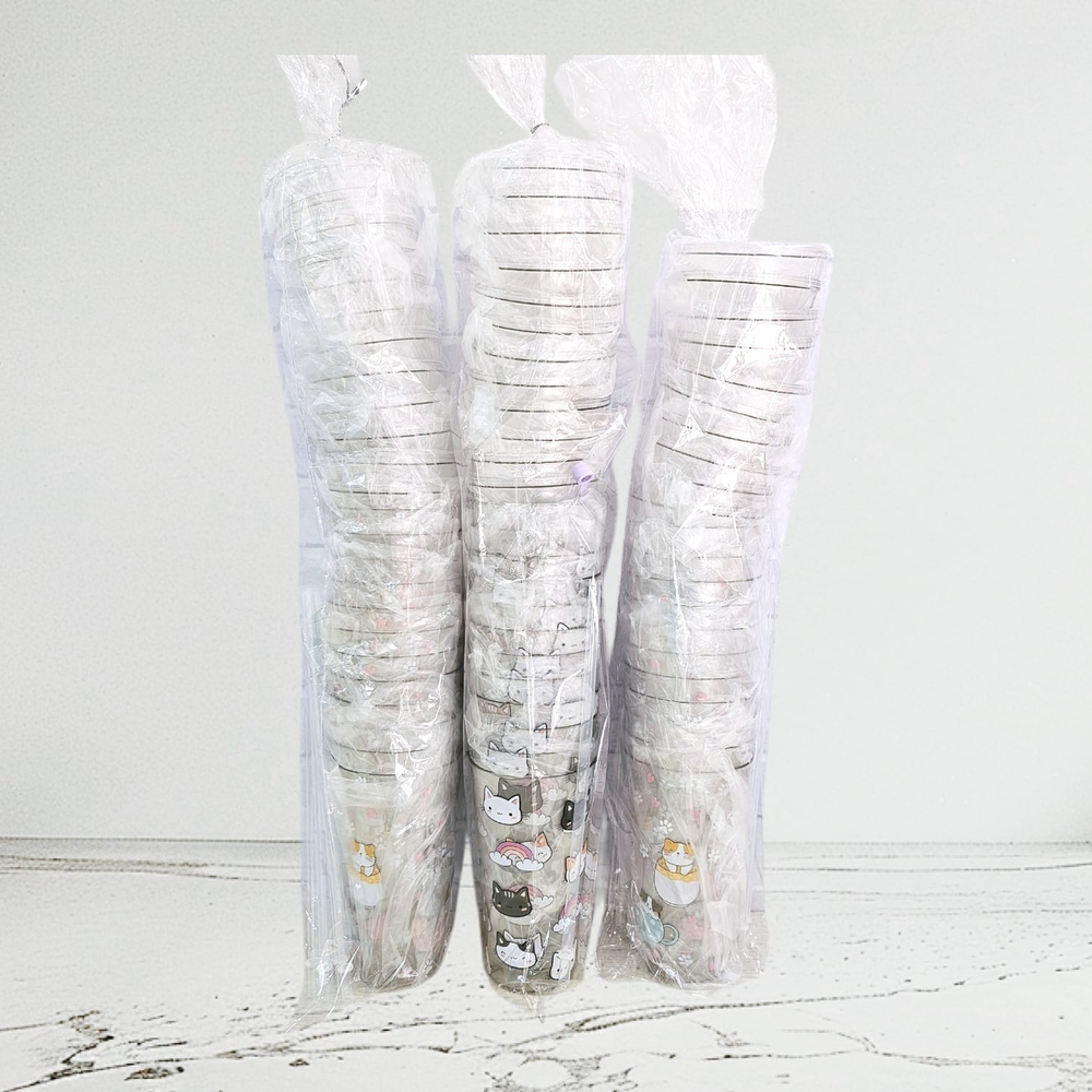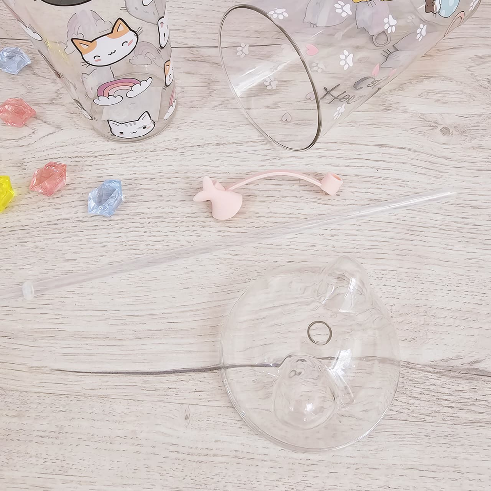 (Vaso con tapa y sorbete. Disponible en 3 colores de tapas, las estampas de gatitos pueden llegar a variar. Capacidad 650ml).