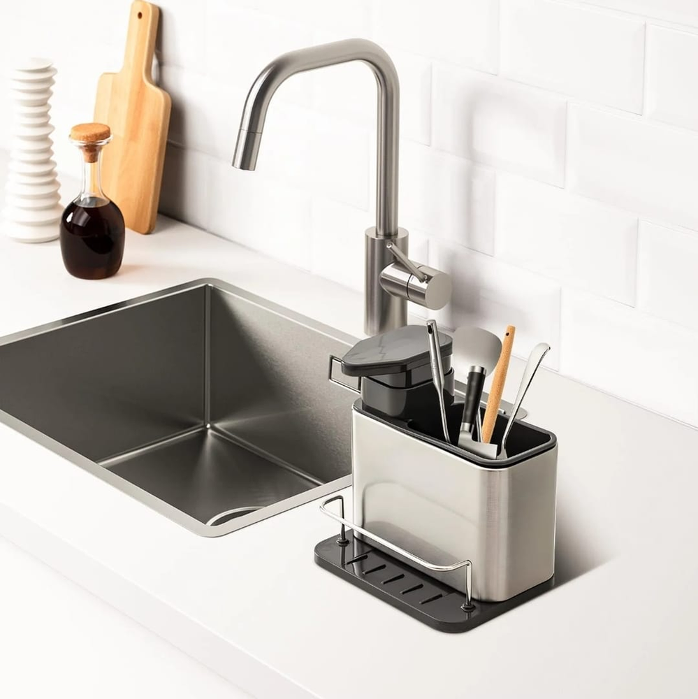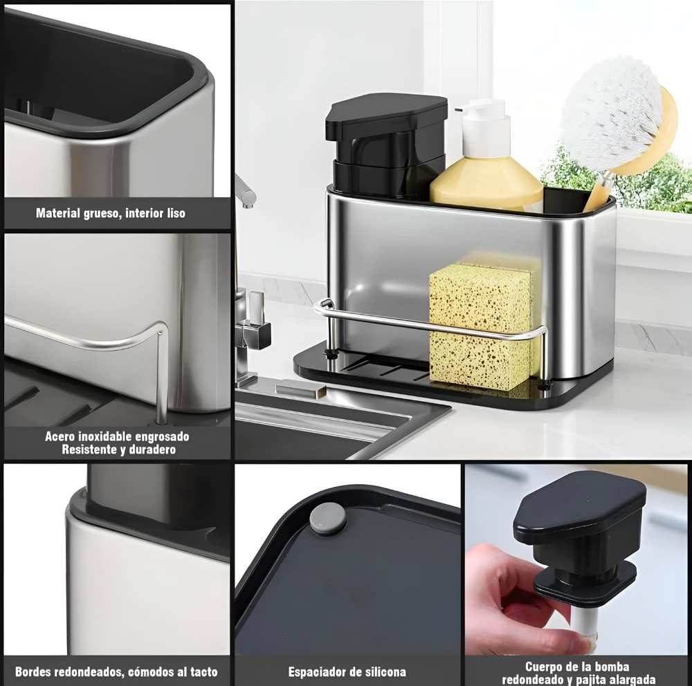 (Cuenta con un contenedor para colocar detergente y un compartimento lateral donde podrás guardar tus esponjas o utensilios, ¡Definitivamente mantendrá tu cocina limpia y ordenada!).
