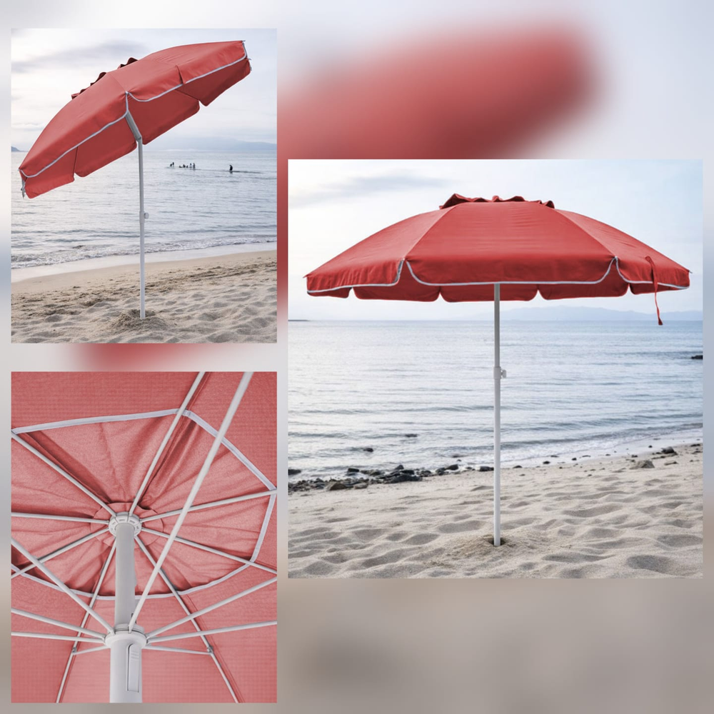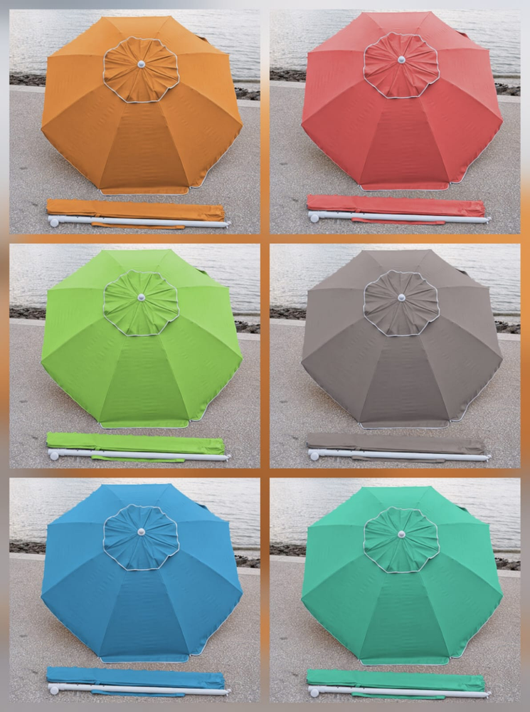 (Sombrilla para playa lisa, tiene ancla de arena integrada. Varillas y altura regulable. Diámetro del caño 3cm aproximadamente).