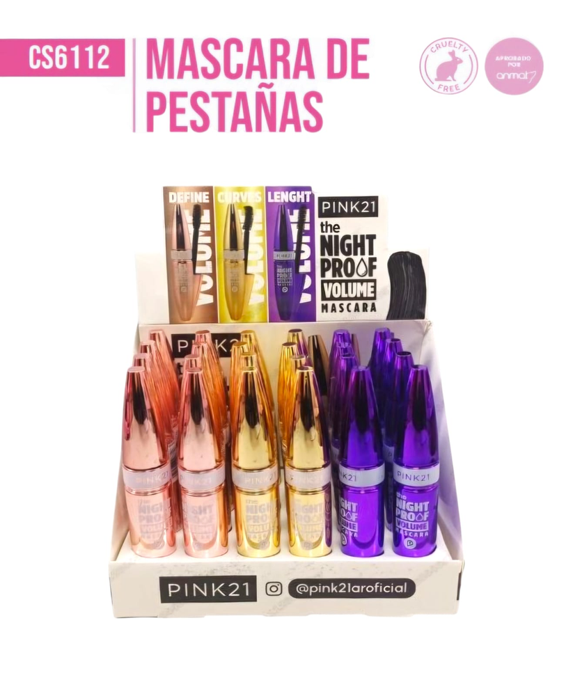 (Caja x 24 Unidades Surtidas. Esta máscara de Pink 21 está diseñada para definir, dar volumen y curvas a tus pestañas).
