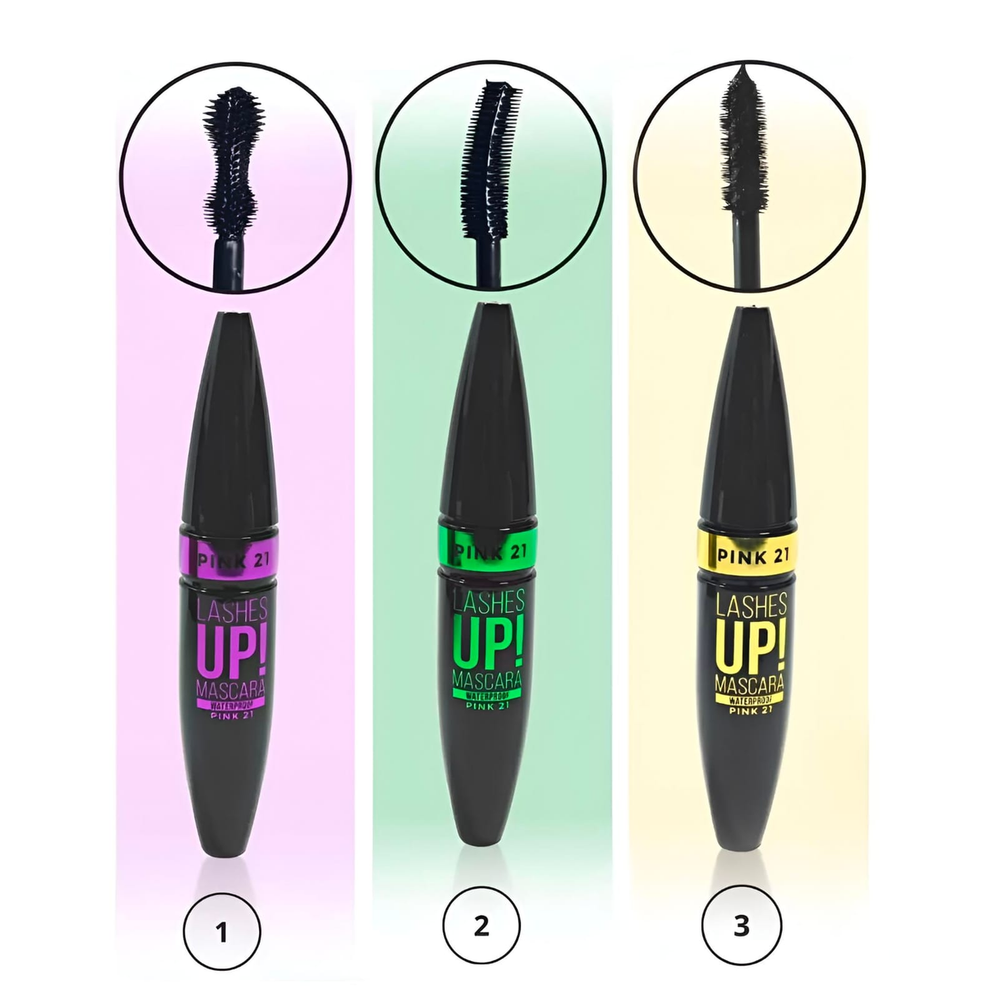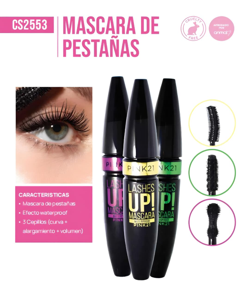 (Esta máscara de Pink 21. Está diseñada para definir, dar volumen y curvas a tus pestañas. Además es impermeable y vienen en 3 opciones de cepillo).