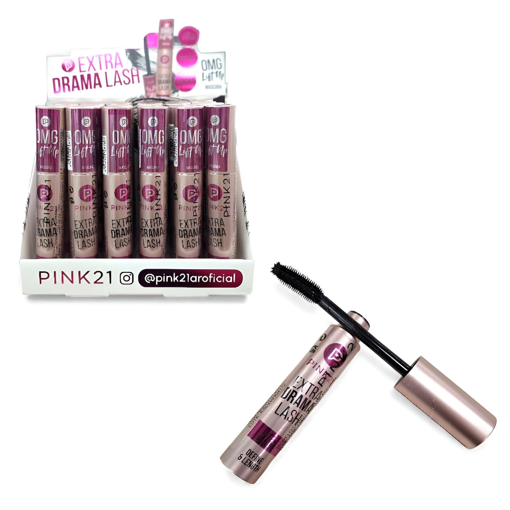 (Caja x 24U de Mascara de pestañas Pink 21. Está diseñada para definir, dar volumen y curvas a tus pestañas).