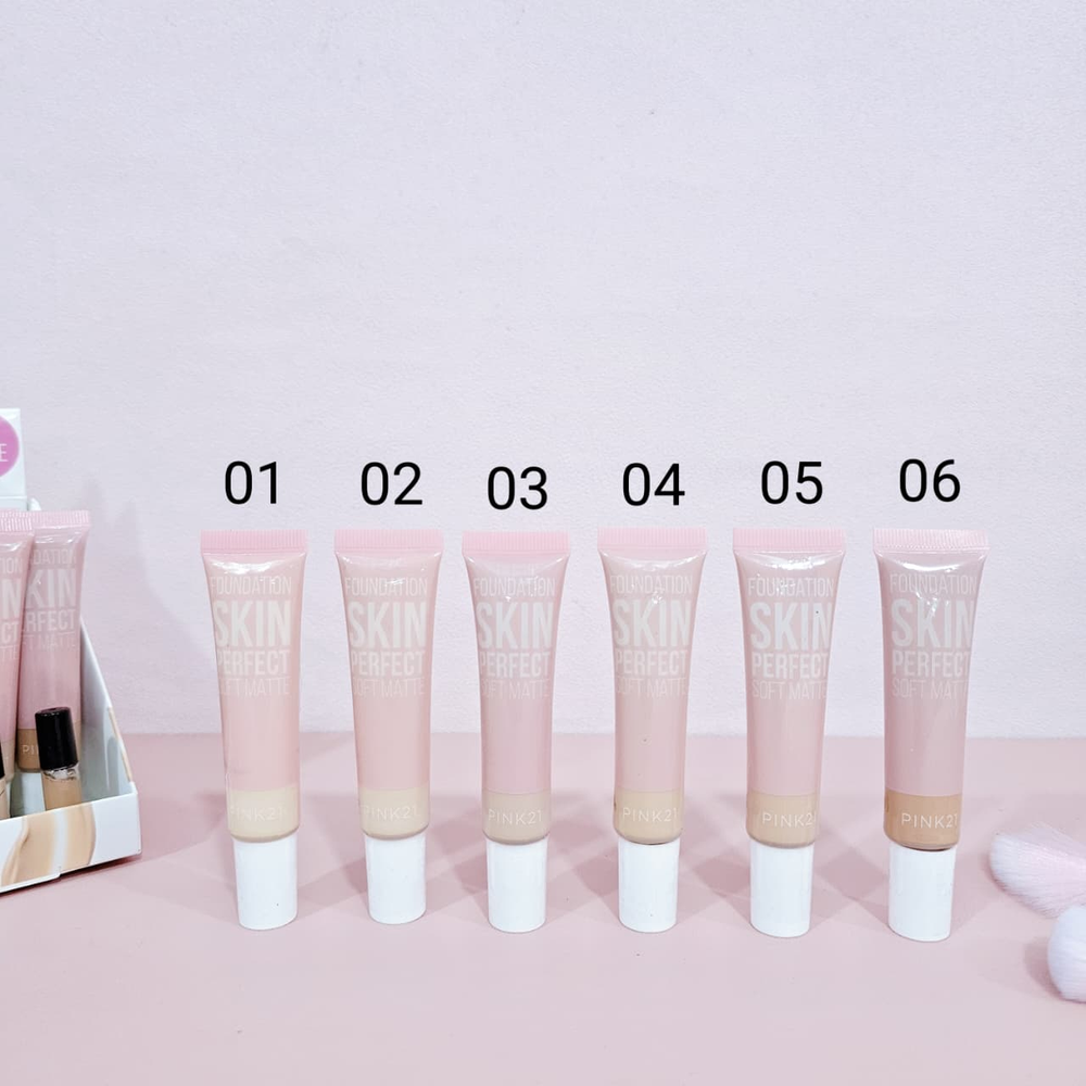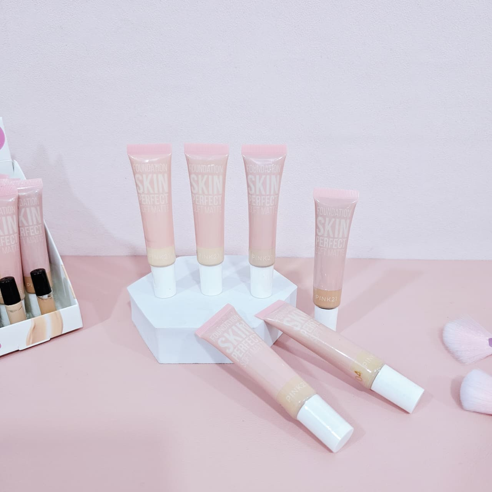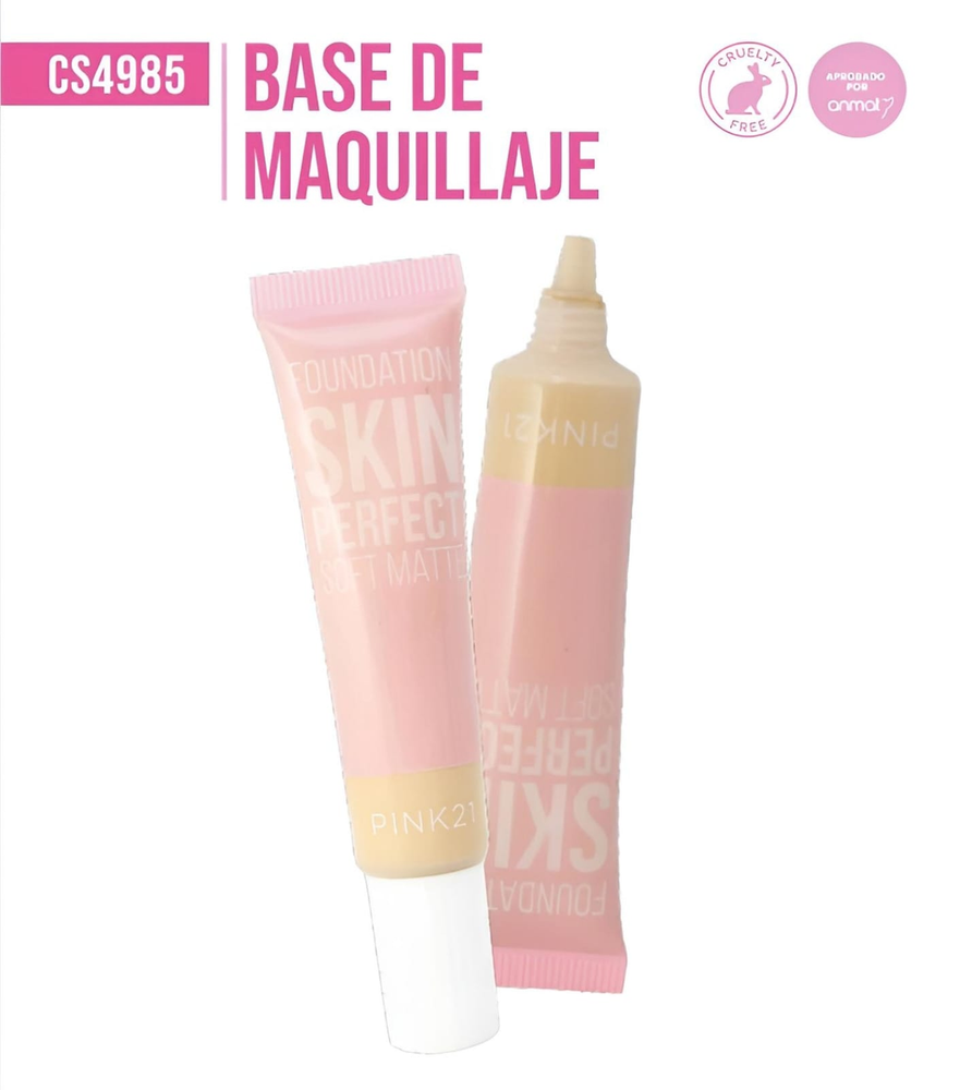 (Base de maquillaje "Pink 21". Es de textura suave, cremosa, y tiene cobertura de media a alta).
