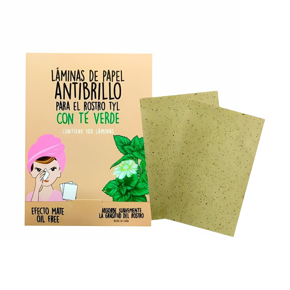 (Estas láminas de papel anti brillo con té verde, son una solución práctica y eficaz para mantener un rostro fresco y sin brillos durante el día).