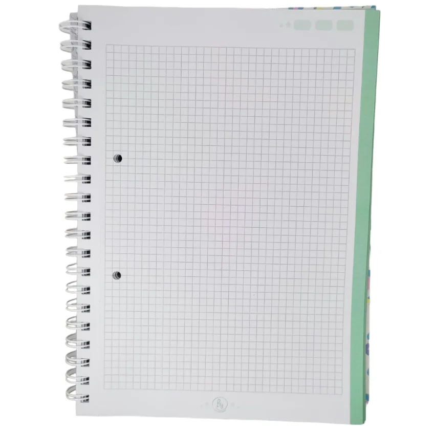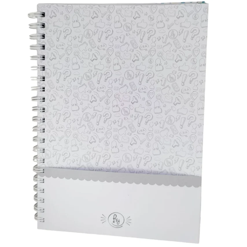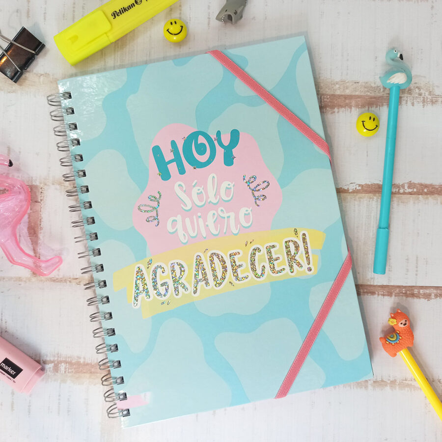 (Cuaderno grande anillado, tapa dura con un elastico a juego cuya función es evitar que estas se habran, incluye tanbién la frase "Hoy sólo quiero agradecer". Trae 100 hojas cuadriculadas. Marca Ry.)