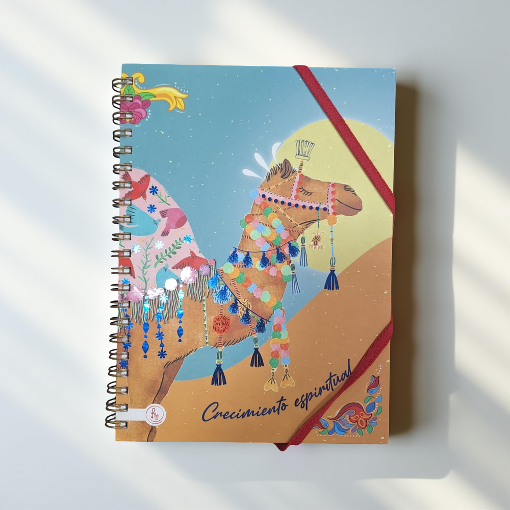 (Cuaderno grande anillado, tapa dura con un elastico a juego cuya función es evitar que estas se habran, con dibujo de camello. Trae 100 hojas rayadas. Marca Ry.)