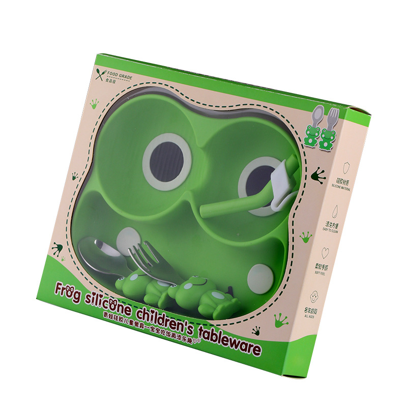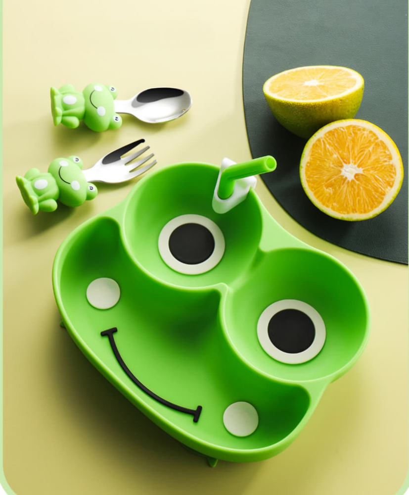 (Set de alimentación de silicona para bebés. Incluye varias piezas, como plato, cubiertos y un sorbete para sopa. Cuenta con un diseño de ventosa grande que lo fija firmemente a la mesa, lo que garantiza que los niños no puedan empujarlo ni volcarlo mientras comen. Está fabricado con silicona de grado alimenticio, libre de BPA).