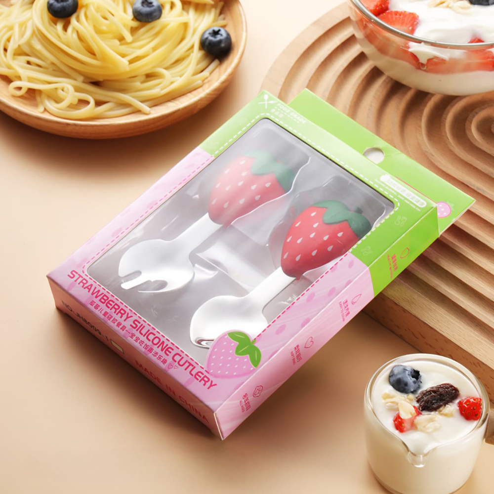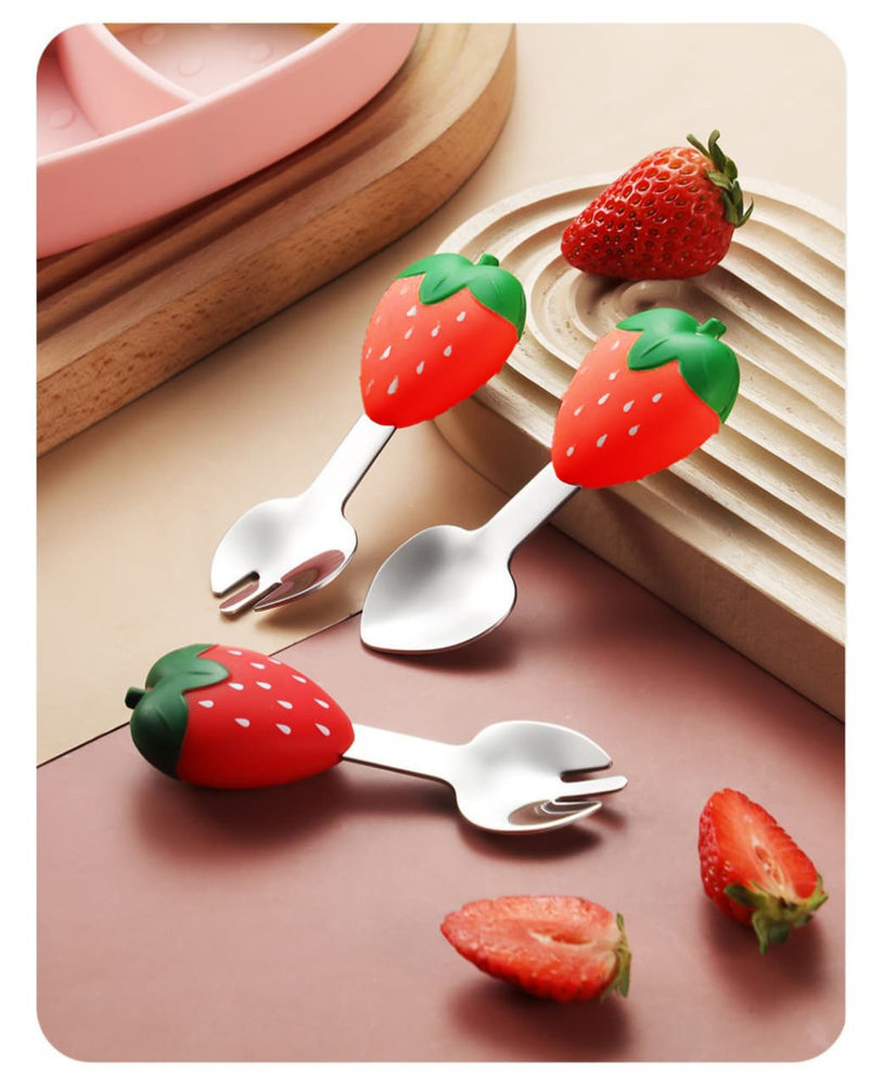 (Set de cubiertos para bebé con diseño de frutilla, material de acero inoxidable 304, manija de silicona para un mejor agarre).