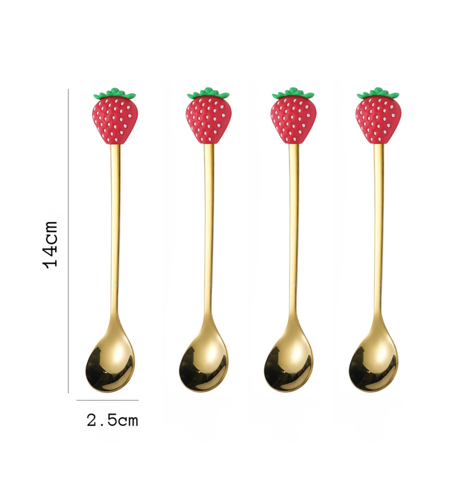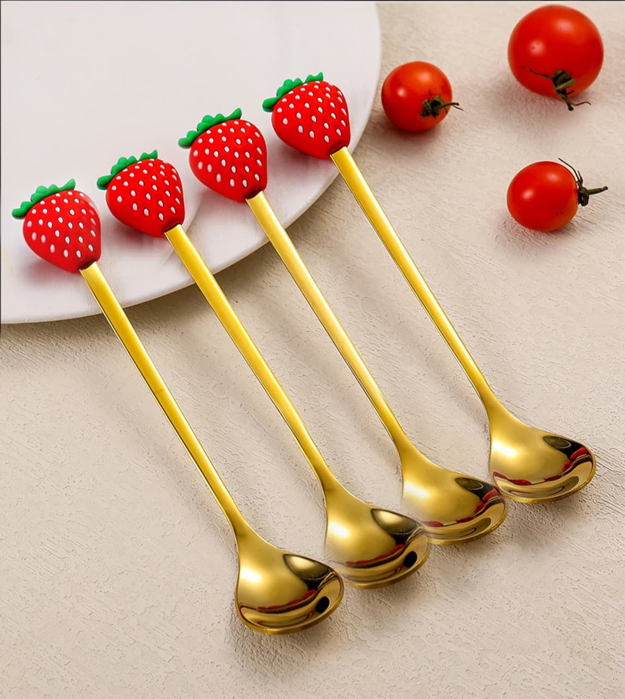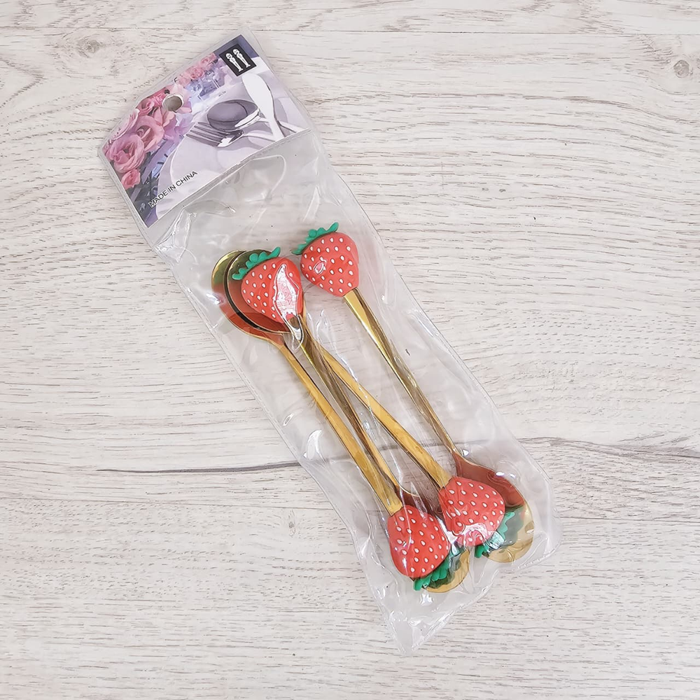 (Set x 4U. Cubiertos de acero inoxidable en color dorado, diseño frutilla con semillitas blancas).