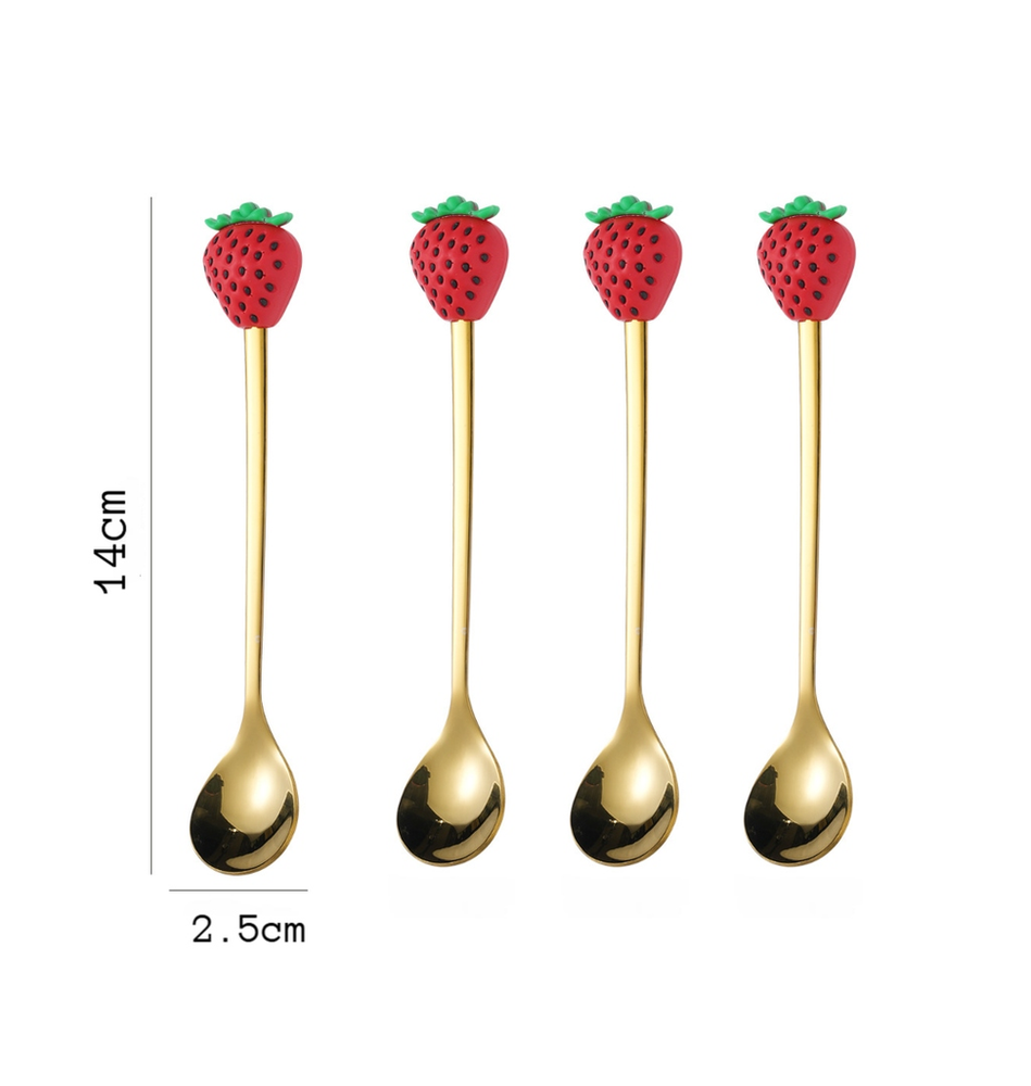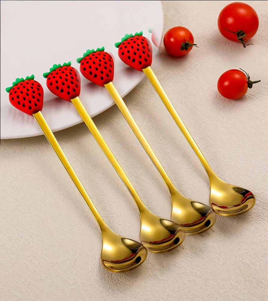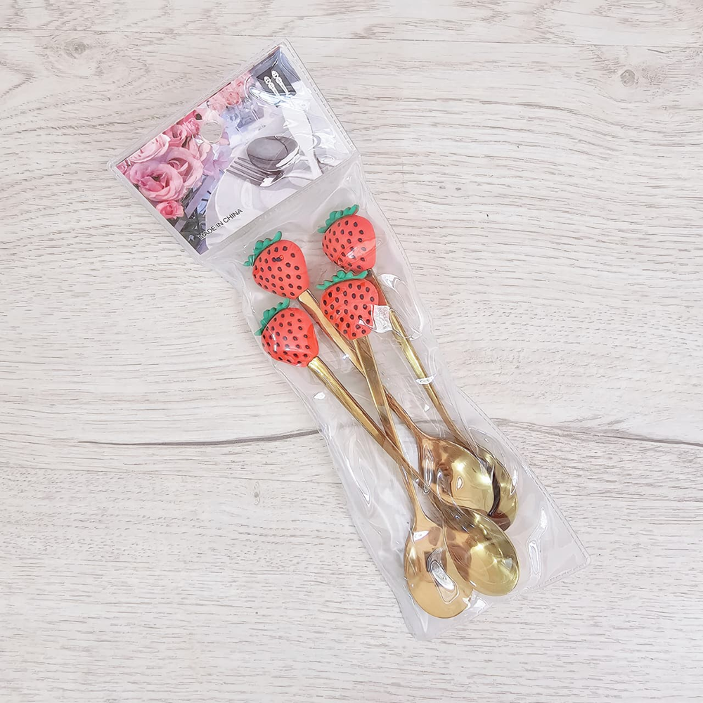 (Set x 4U. Cucharas de acero inoxidable en color dorado, diseño frutilla con semillitas negras).