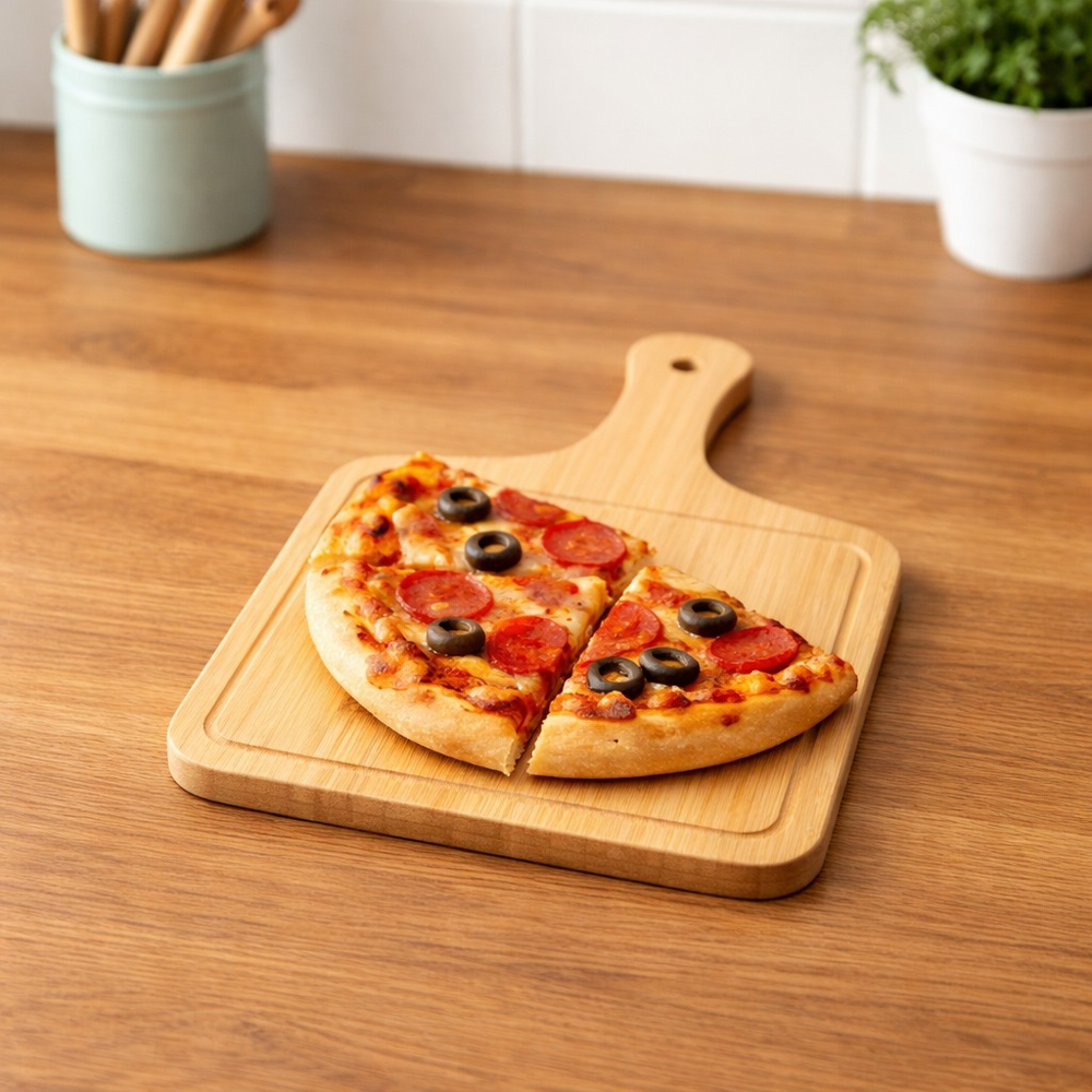 (Es versátil, diseñada para cortar y servir alimentos como pizza y frutas).