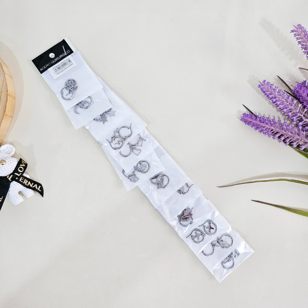 (Aritos plateados con dijes calados de acero quirúrgico. Excelente calidad. Super finos y delicados para cualquier ocasión. El dije puede ser removido a gusto personal dejando solamente la argolla)