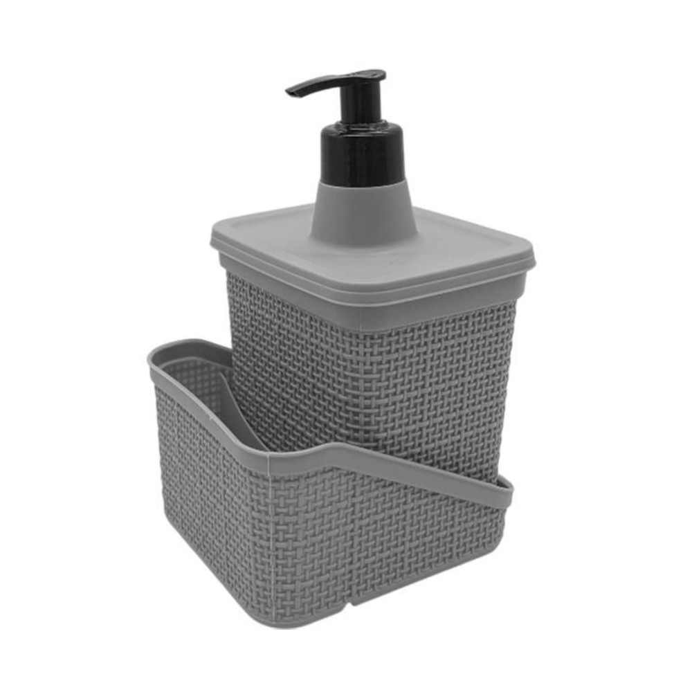 (Combina un dispensador para jabón o detergente con un espacio para organizar otros elementos como esponjas, cepillos o utensilios. Esta hecho en plástico, es liviano y resistente).