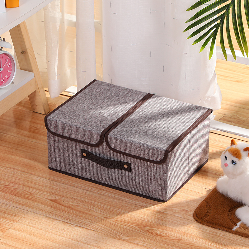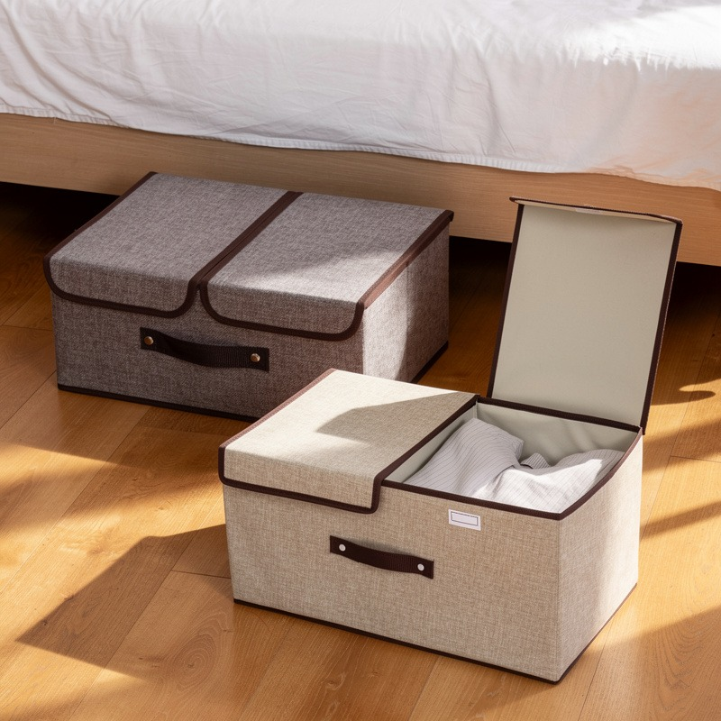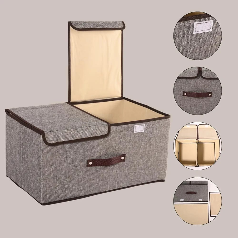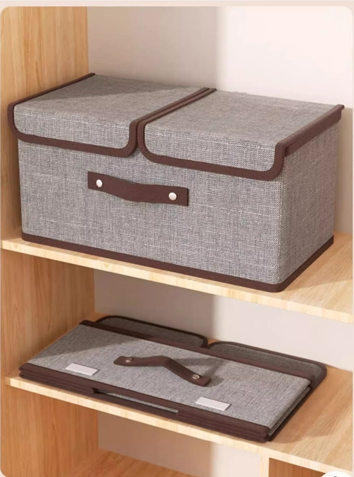 (Organizadores de tela plegables con tapa, diseñados específicamente para el guardado de ropa, sábanas o juguetes en placares y debajo de la cama. Su estructura permite que se desarmen y guarden fácilmente cuando no están en uso, ahorrando espacio).