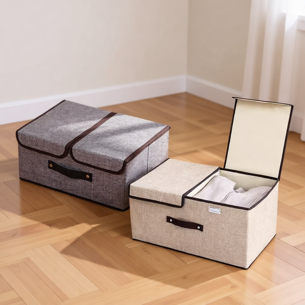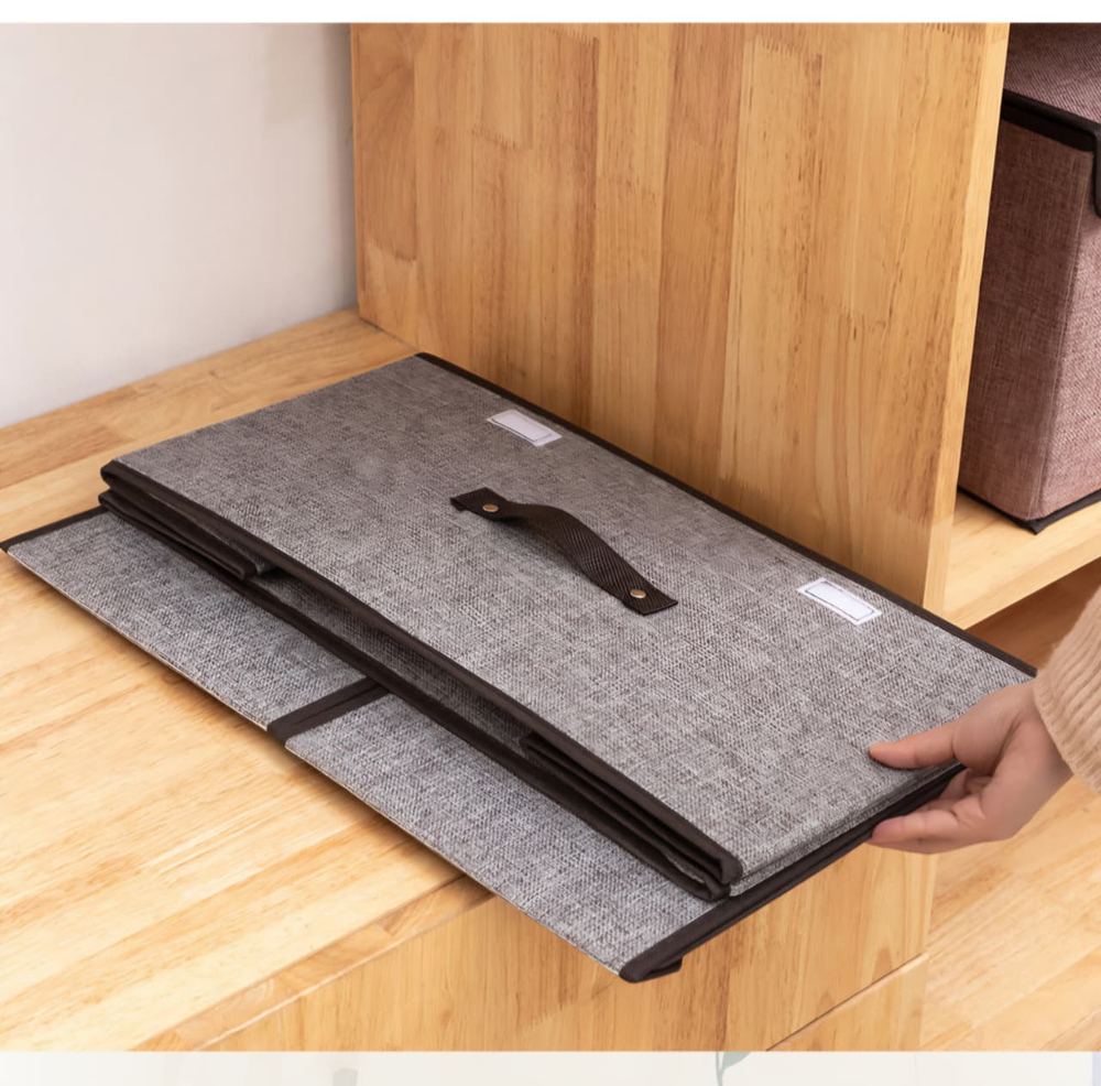 (Caja organizadora de multiuso que puede taparse, diseño perfecto para guardar en esquinas así poder aprovechar el máximo espacio. Ideal para guardar mantas y/o prendas delicadas. Hecho con materiales ecológicos. Este es aprueba de humedad lo que hace que el contenido no se arruine, de fácil limpieza).
