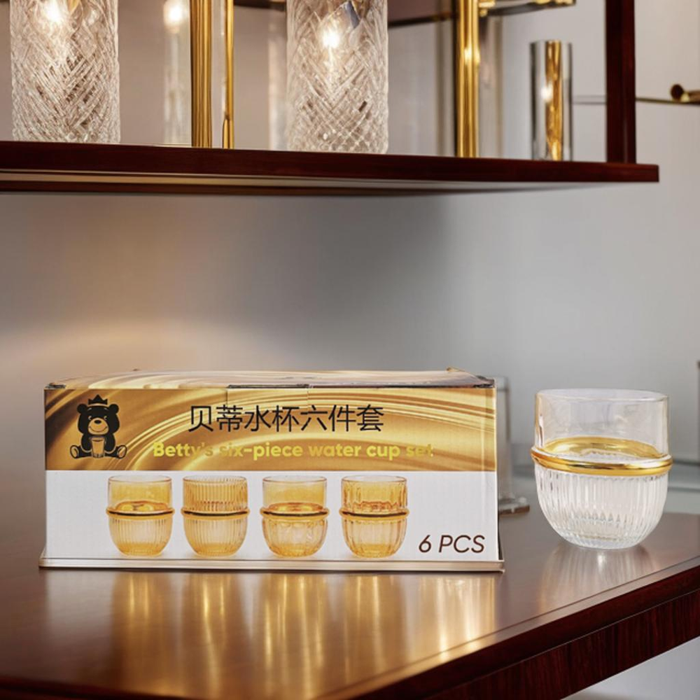 (Juego de 6 vasos de vidrio con detalles en dorado)
