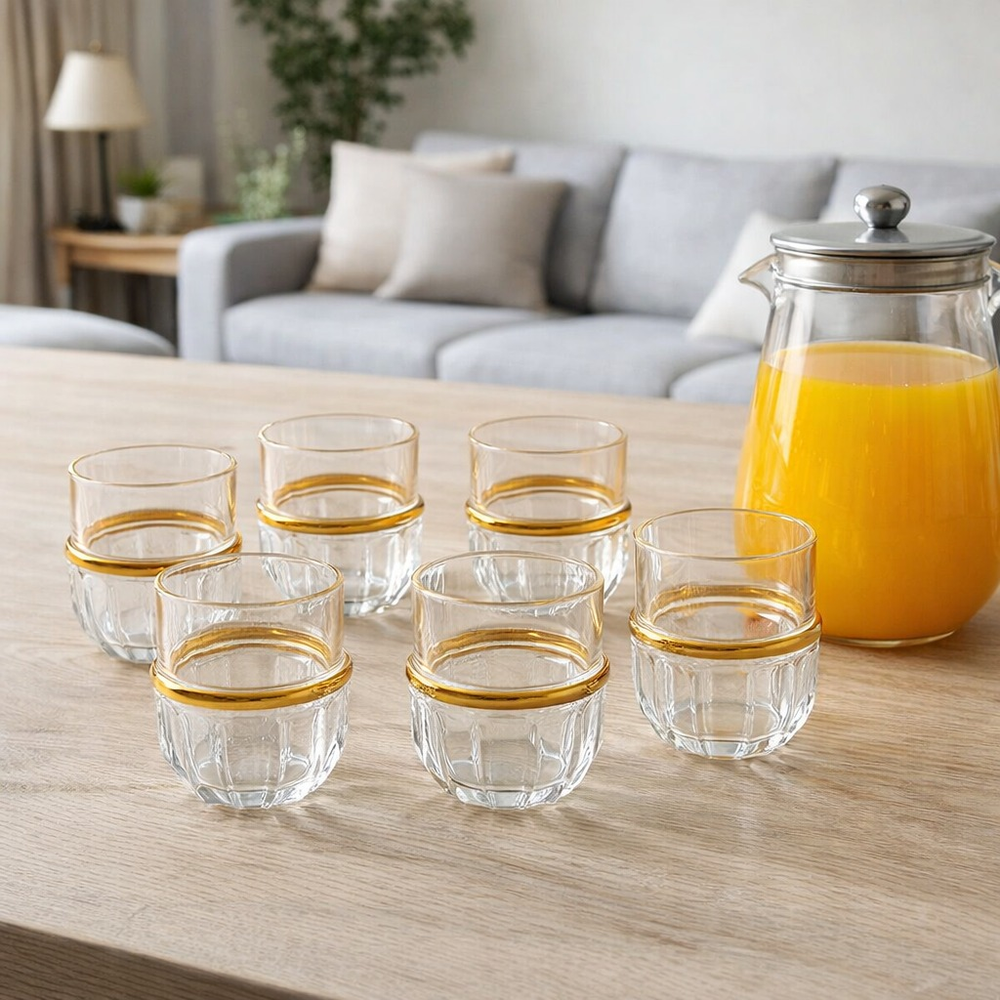 (Juego de 6 vasos de vidrio con detalles en dorado)