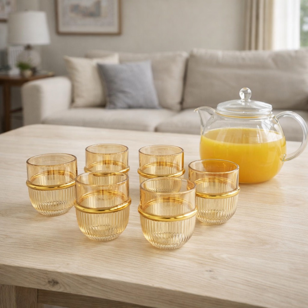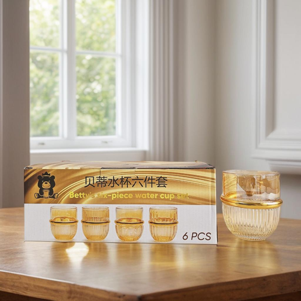 (Juego de 6 vasos de vidrio con detalles en dorado)