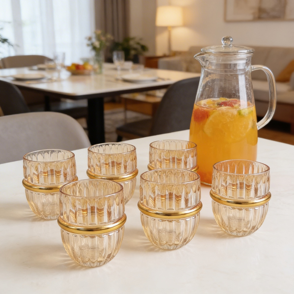 (Juego de 6 vasos de vidrio con detalles en dorado)