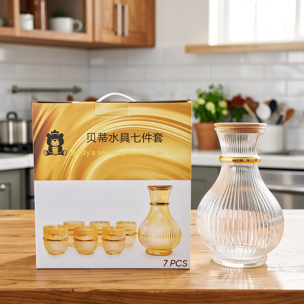 (Presenta un diseño de vidrio transparente con rayas verticales y detalles dorados. Ideal para reuniones y eventos. La jarra cuenta con una tapa de madera).
