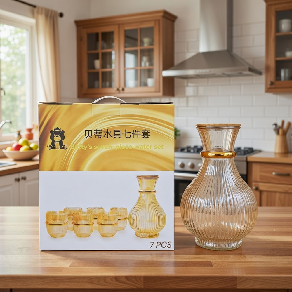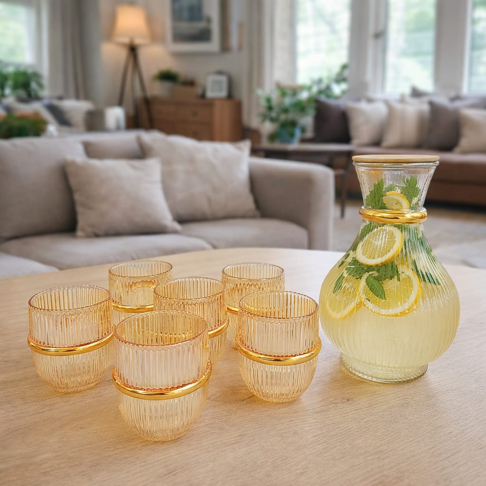 (Presenta un diseño de vidrio transparente acanalado con detalles dorados. y detalles dorados. Ideal para reuniones y eventos. La jarra cuenta con una tapa de madera).