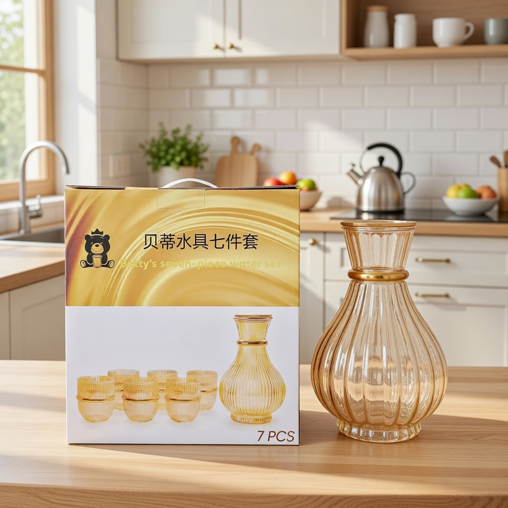 (Presenta un diseño de vidrio transparente acanalado con detalles dorados. y detalles dorados. Ideal para reuniones y eventos. Incluye jarra con tapa de madera y 6 vasos ).