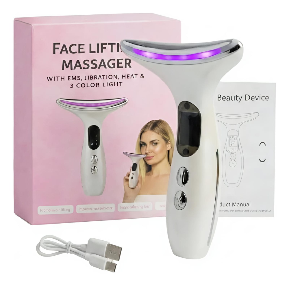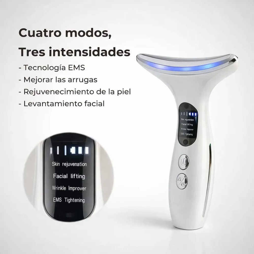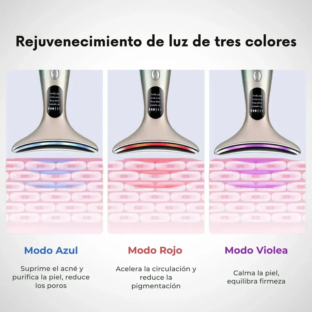( Mantenga presionado el botón para prender y apagar. Masajeador facial y cuello cuenta con 3 modos de luz LED para revitalizar el colágeno, reducir el acné y mejorar la microcirculación. Ayuda a reafirmar la piel, reducir arrugas, definir la línea de la mandíbula y mejorar la absorción de cremas. Posee vibración mecánica y terapia de calor. Su diseño ergonómico permite adaptarse a los contornos del rostro).