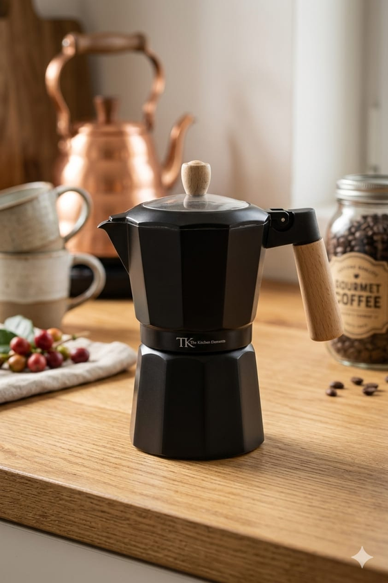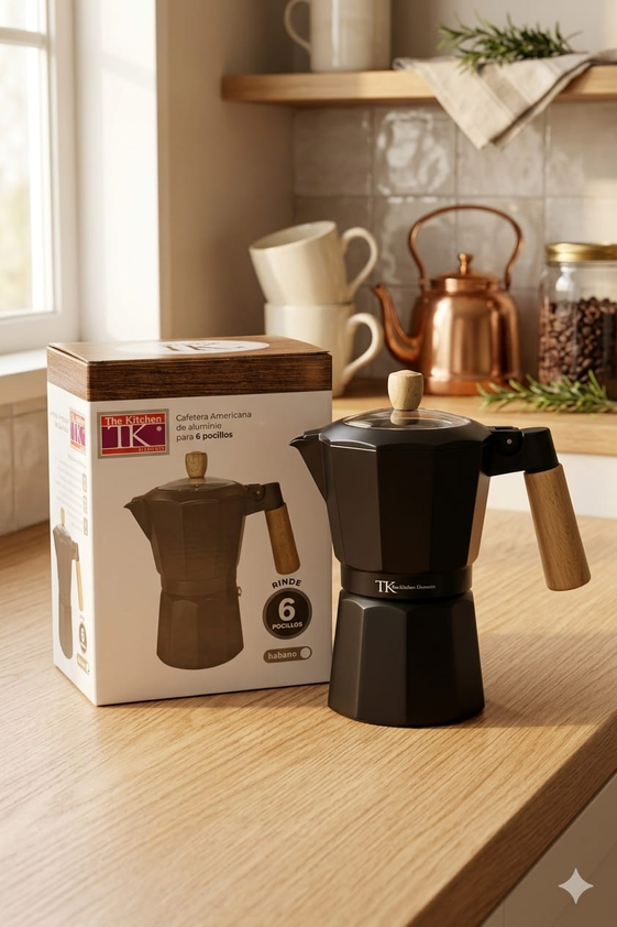 ( Cafetera Italiana " The Kitchen" cuenta con una estructura de aluminio que permite distribuir el calor de manera uniforme, logrando una preparación pareja y eficiente. Su mango con acabado simil madera aporta seguridad al servir y un estilo moderno que queda perfecto en cualquier cocina. Funciona en cocina a gas, eléctrica y vitrocerámica. Capacidad: 300 CC. aprox.).