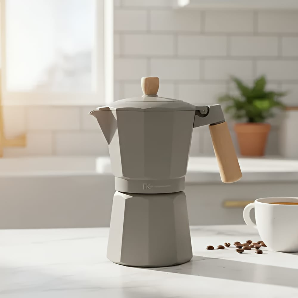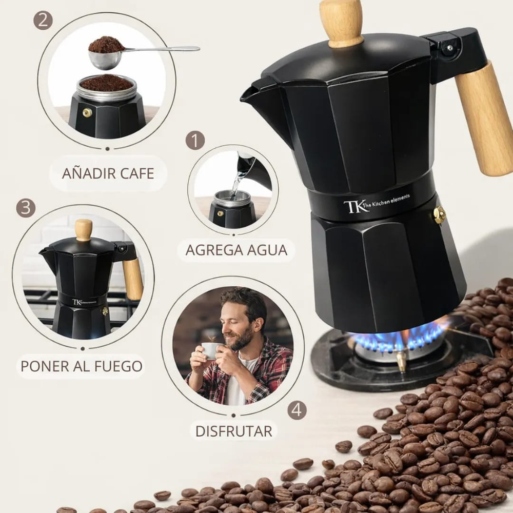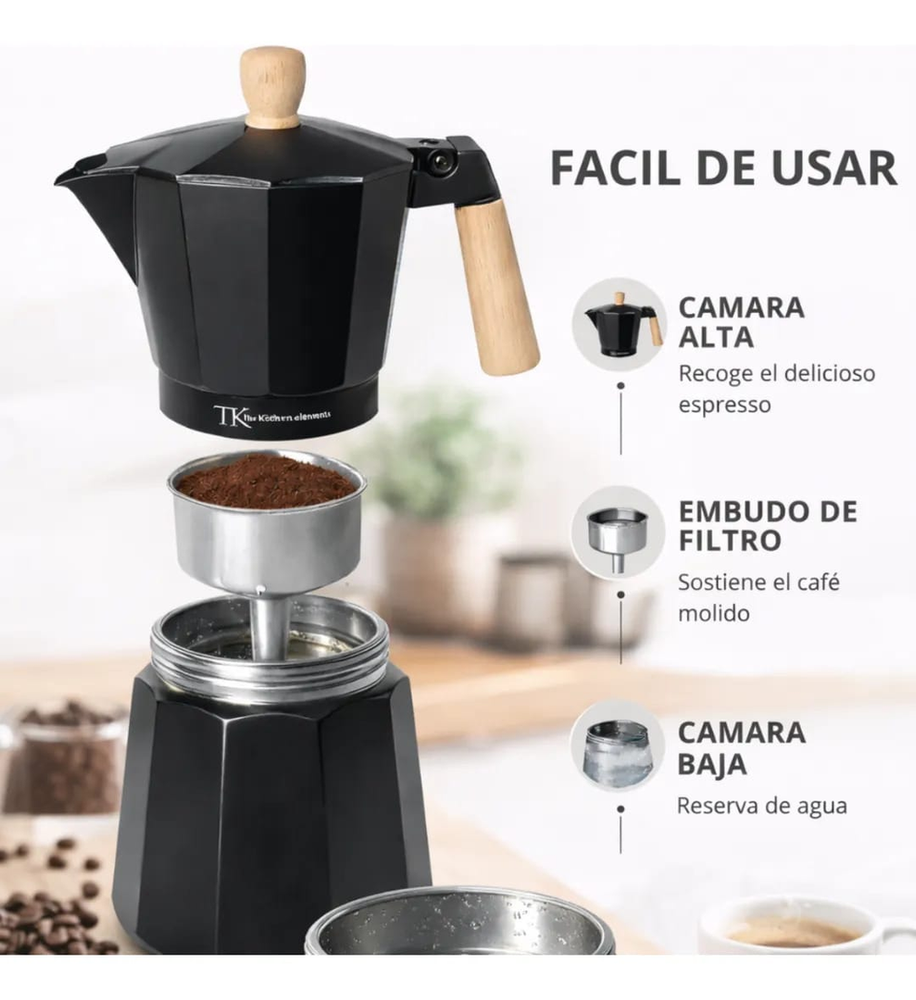 ( Cafetera Italiana " The Kitchen" cuenta con una estructura de aluminio que permite distribuir el calor de manera uniforme, logrando una preparación pareja y eficiente. Su mango con acabado simil madera aporta seguridad al servir y un estilo moderno que queda perfecto en cualquier cocina. Funciona en cocina a gas, eléctrica y vitrocerámica. Capacidad: 300 CC. aprox.).
