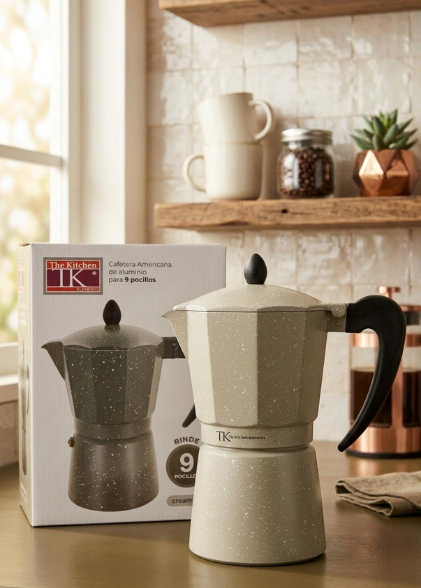 (Cafetera Italiana " The Kitchen" cuenta con una estructura de aluminio que permite distribuir el calor de manera uniforme, logrando una preparación pareja y eficiente. Funciona en cocina a gas, eléctrica y vitrocerámica).