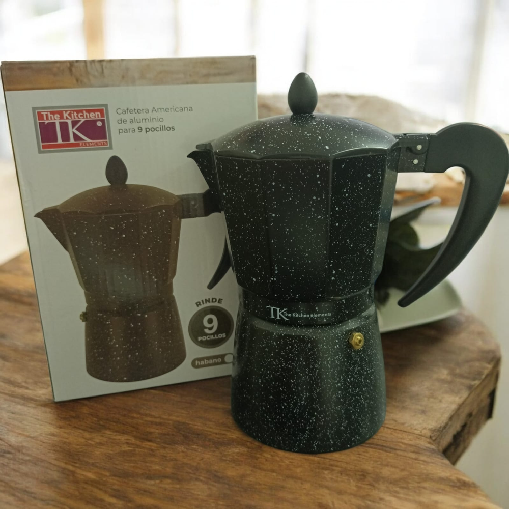 (Cafetera Italiana " The Kitchen" cuenta con una estructura de aluminio que permite distribuir el calor de manera uniforme, logrando una preparación pareja y eficiente. Funciona en cocina a gas, eléctrica y vitrocerámica).