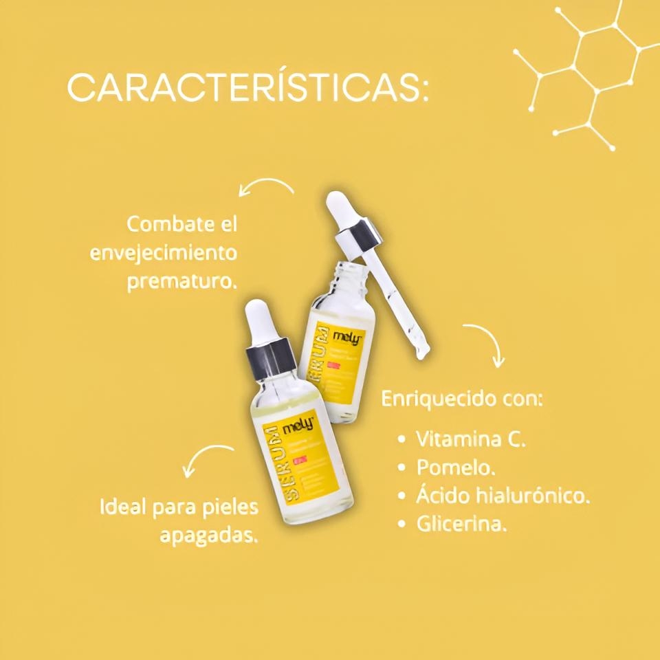 (Ilumina y revitaliza tu rostro con este sérum rico en vitamina C, pomelo, ácido hialurónico y glicerina. Combatí el envejecimiento prematuro, reducí manchas y disfruta de una piel más uniforme y luminosa).