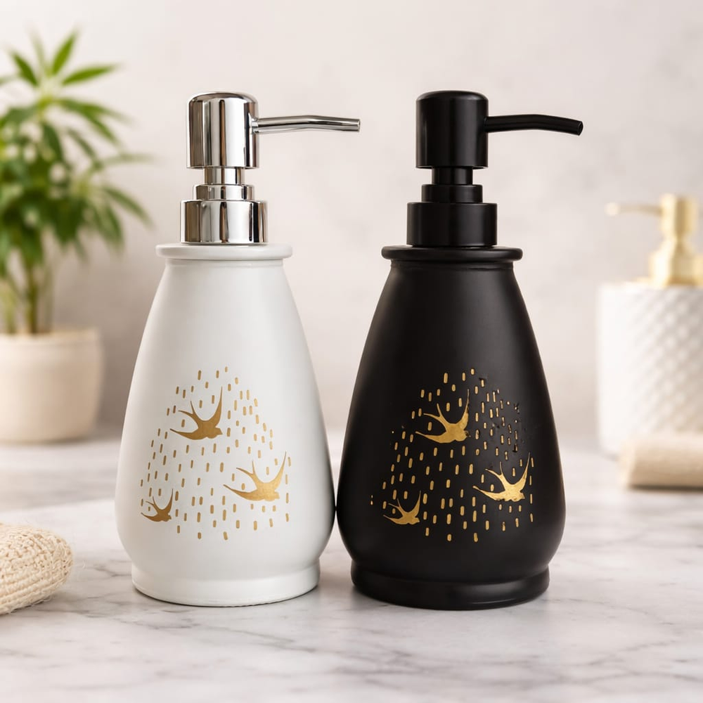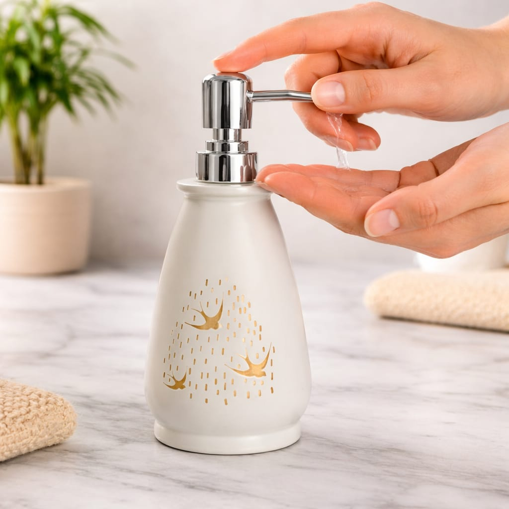 (Dispenser de cerámica para jabón liquido. Excelente calidad y terminación. Diseño detalles en dorado).