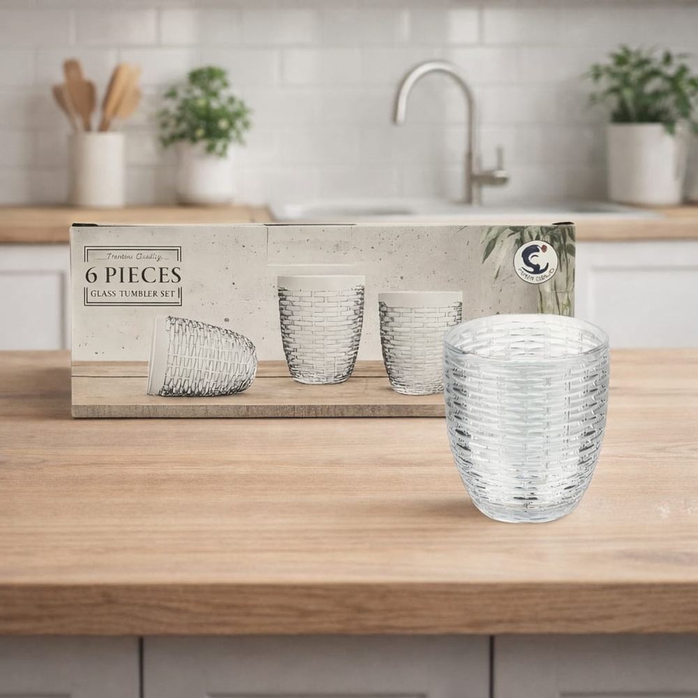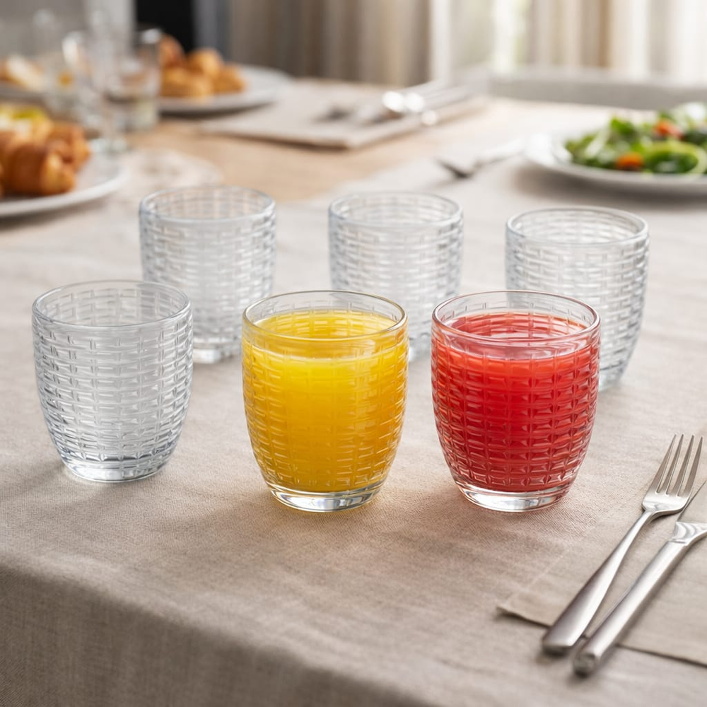 (Set x 6 Vasos. Diseño con relieve y cuerpo ancho, resistentes a roturas y apto lavavajillas. Ideal para usar en cenas familiares).
