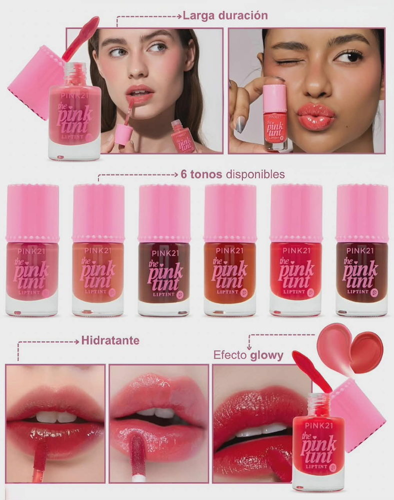 (Tinta para Labios The Pink Tint "Pink 21". Disponible en 6 tonos diferentes, efecto glowy. De larga duración. Ideal para mantener tus labios hidratados).
