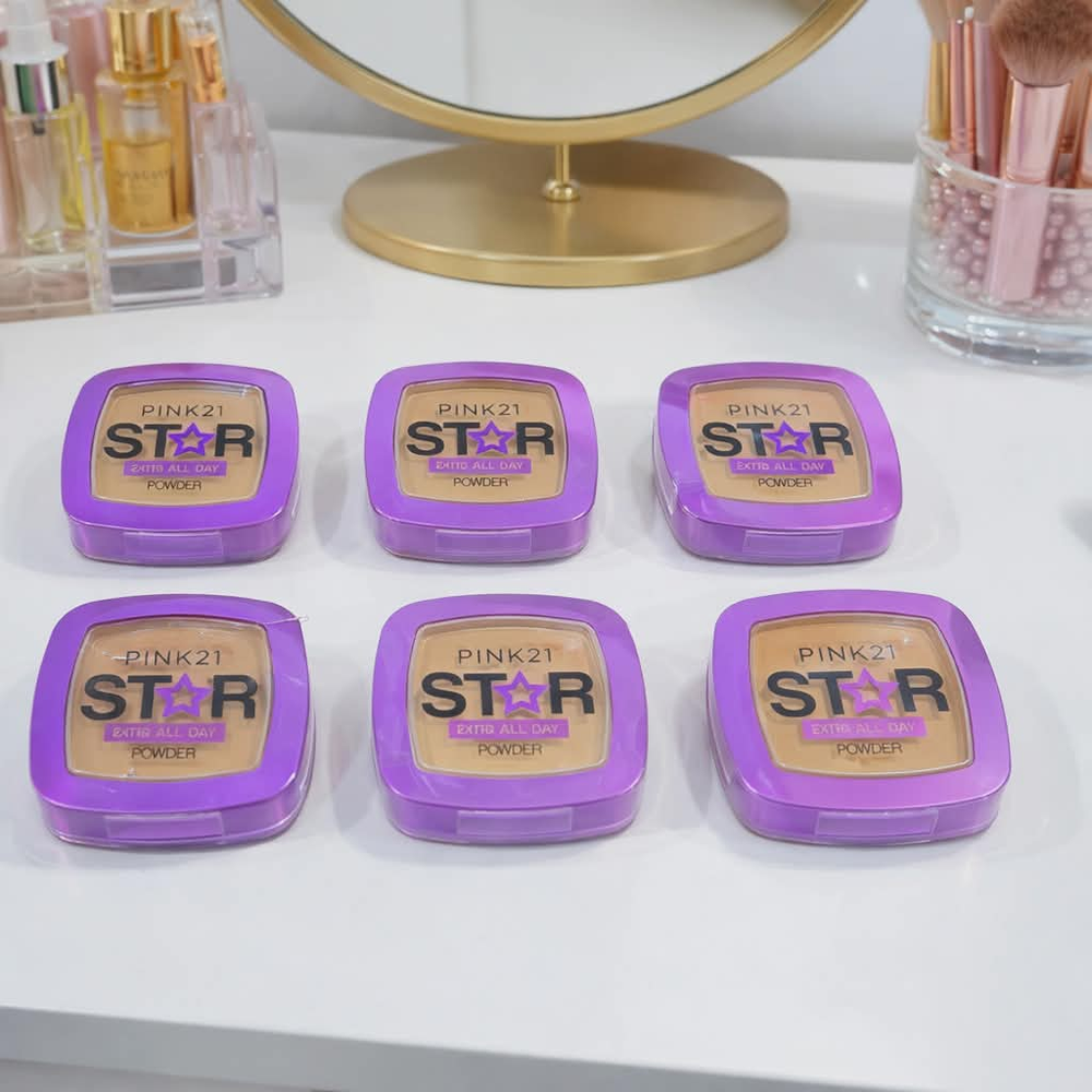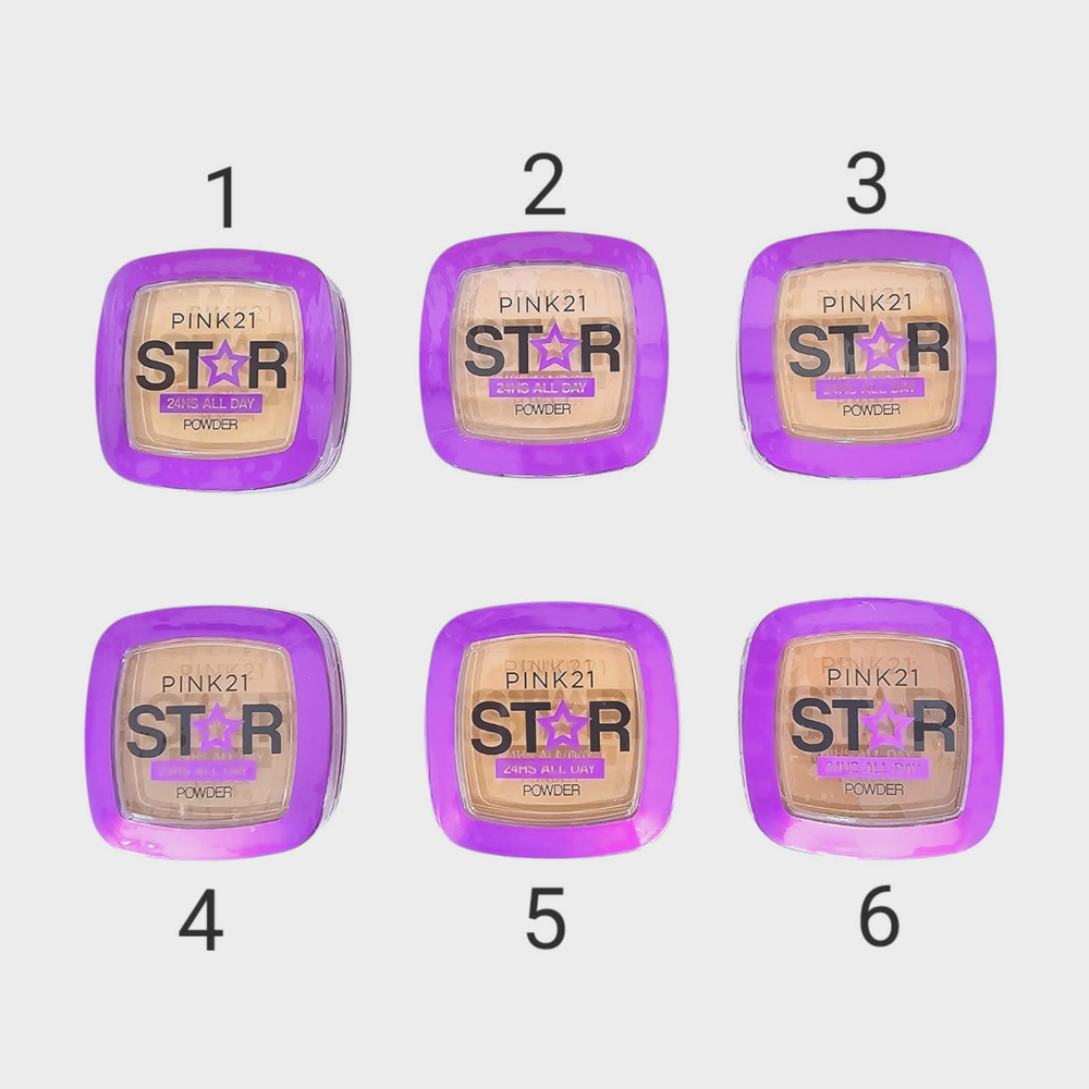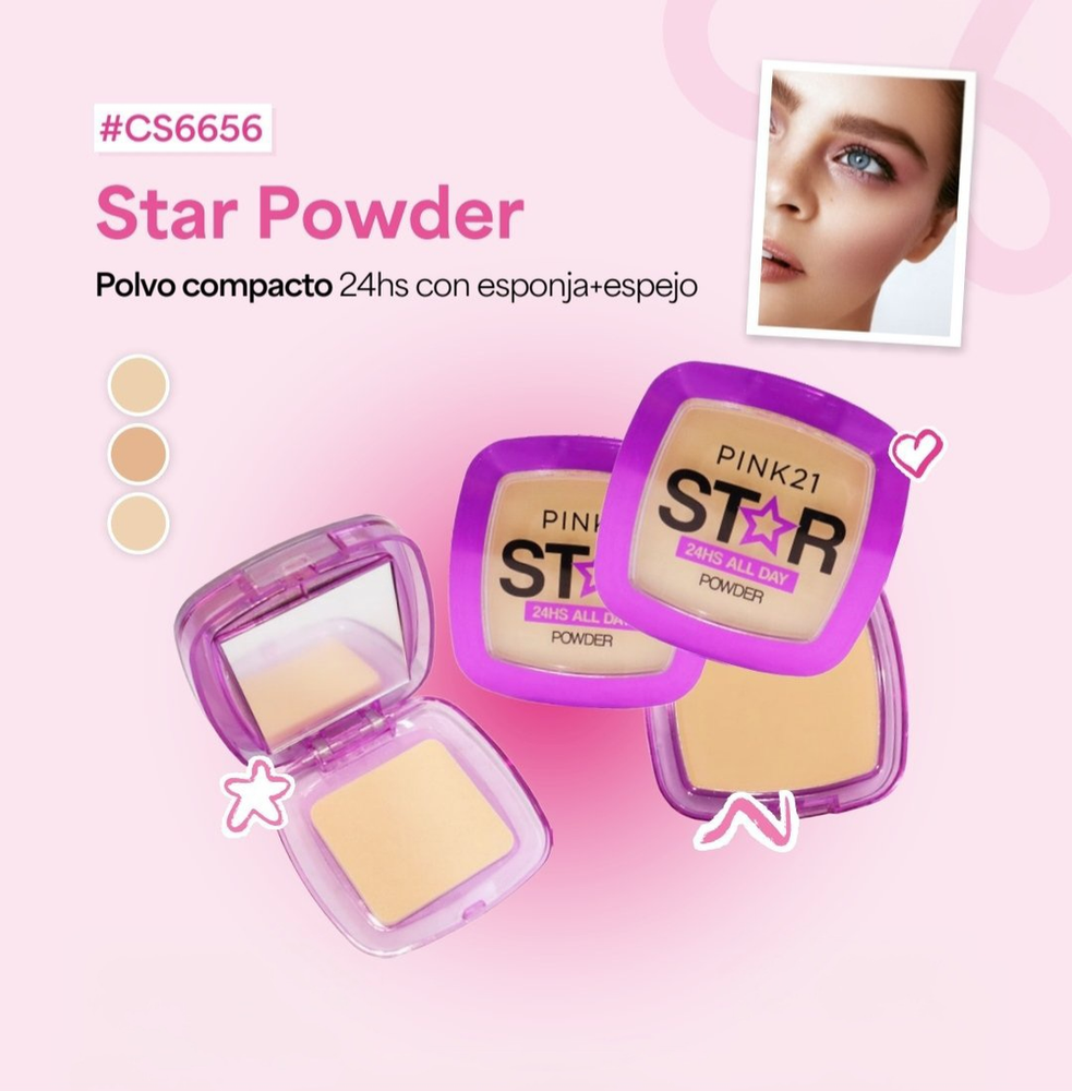 (Polvo Compacto Star "Pink 21" disponible en 6 tonos a elección con espejo y aplicador. Ideal para un maquillaje natural y uniforme).