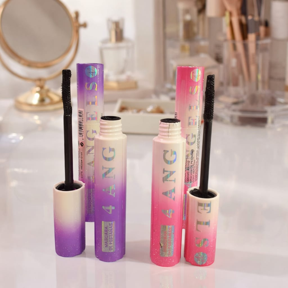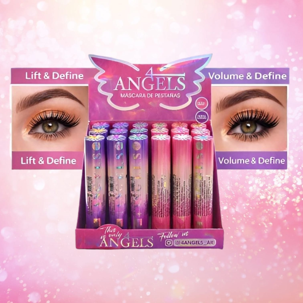 (Máscara de pestañas "4 Angels, eleva, define y da volumen a tus pestañas. Ideal para que no falte en tu maquillaje).