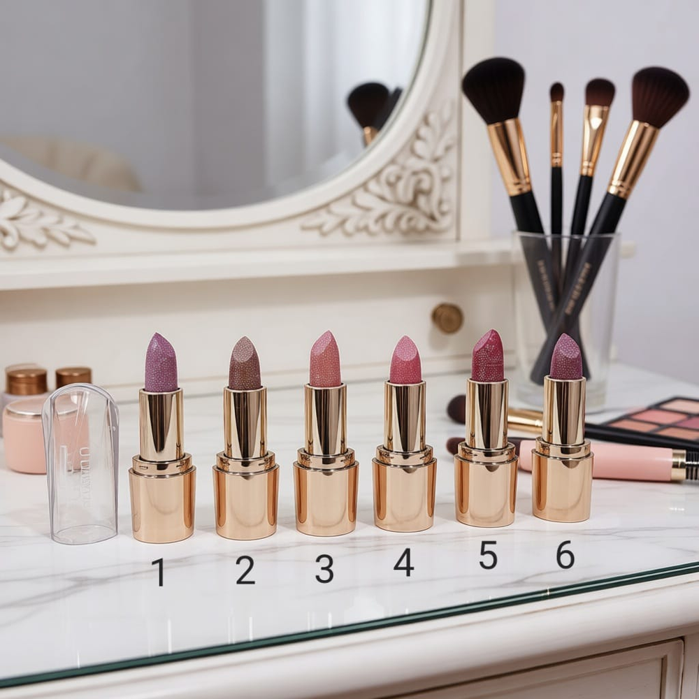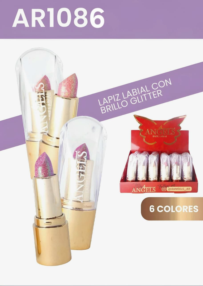 ( Lápiz Labial "4 Angels" con brillo glitter. Disponible en 6 tonos).