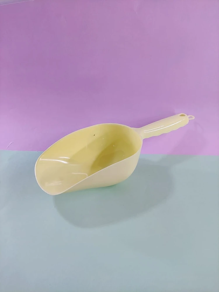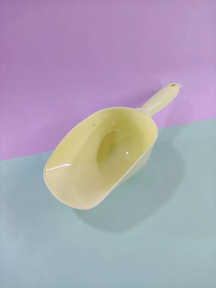 (Pala para alimentos grande, de material plástico. Color amarillo. Con orificio para colgar. Categorizado en accesorios para mascotas).