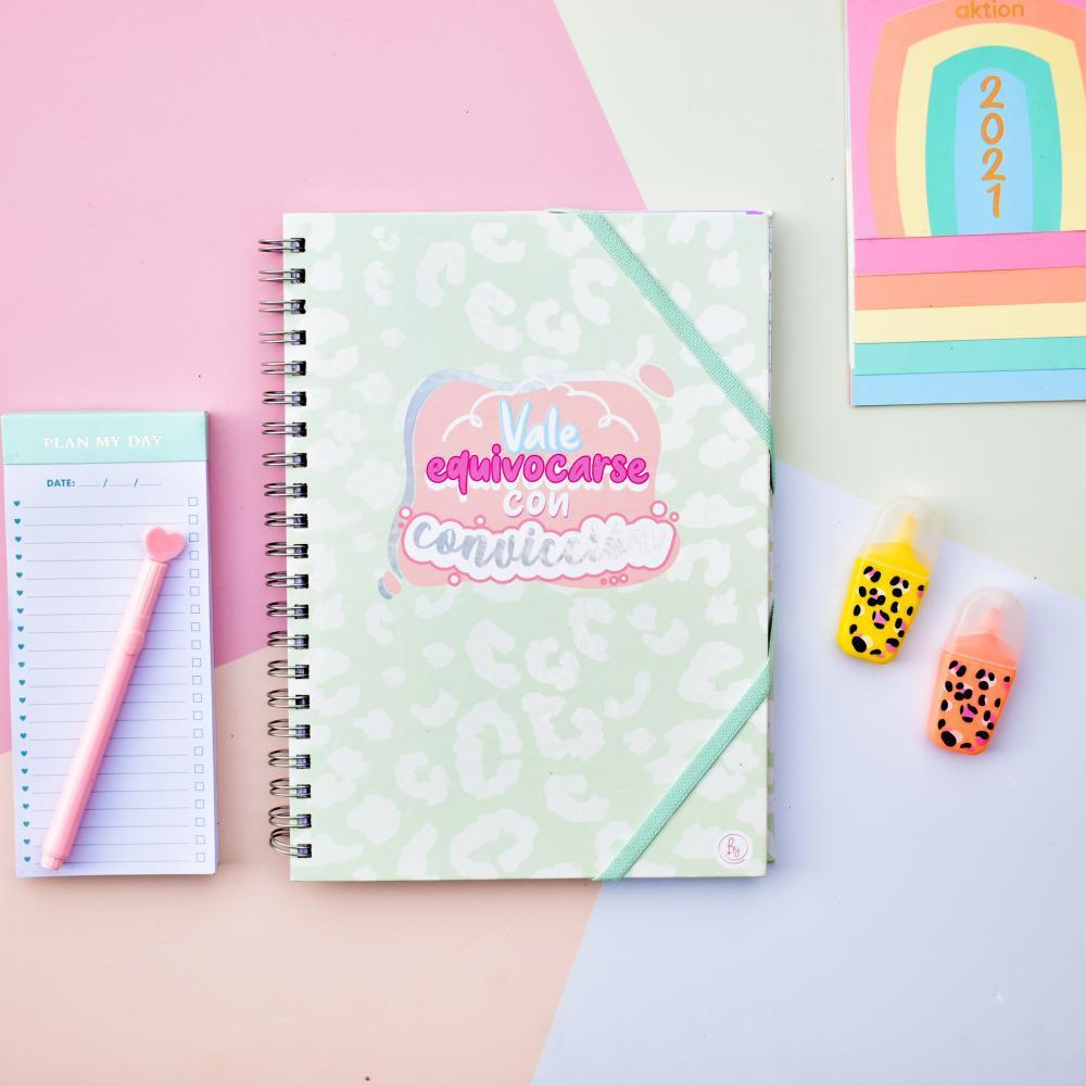 (Cuaderno rayado de 100 hojas de la linea Motivación Creativa de la marca Ryproductos, tapa dura, color verde agua con manchas blancas y frase ''Vale equivocarse con convicción'', anillos de metal y elásticos en las esquinas para cerrar el cuaderno. Además trae 8 hojas con puntos alineados para dibujos o caligrafía. Categorizado en: Librería)