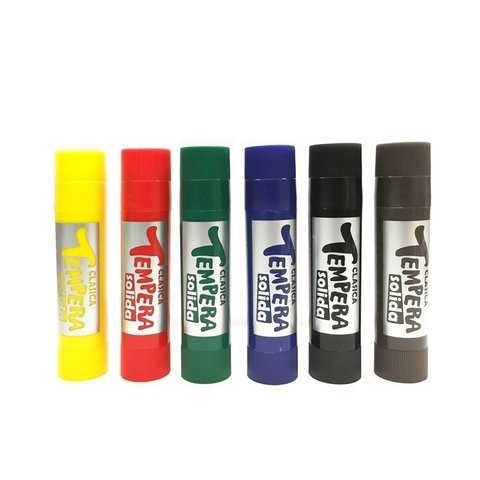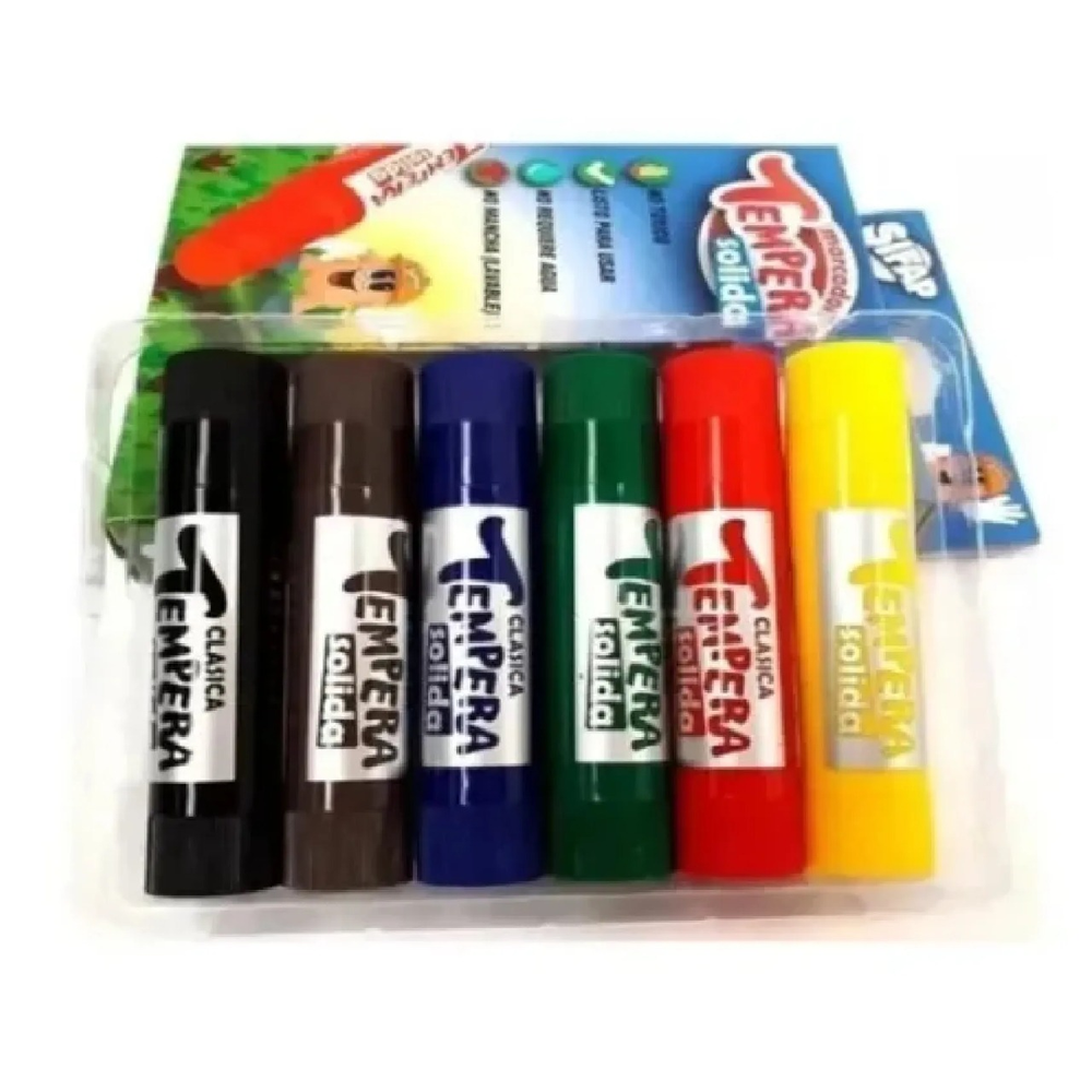 (Tempera solida marca ''Sifap'' en barra con 6 colores, amarillo, rojo, verde, azul, marrón, y negro. Practico viene en un marcador, sacas la tapa y esta listo para usar no requiere agua, cuando se te acabe solo hay que girar la parte de abajo y saldrá la barra de tempera solida, no mancha, es lavable y No es toxica. Edad recomendada para mayores de 3 años. Categorizado en: Librería)